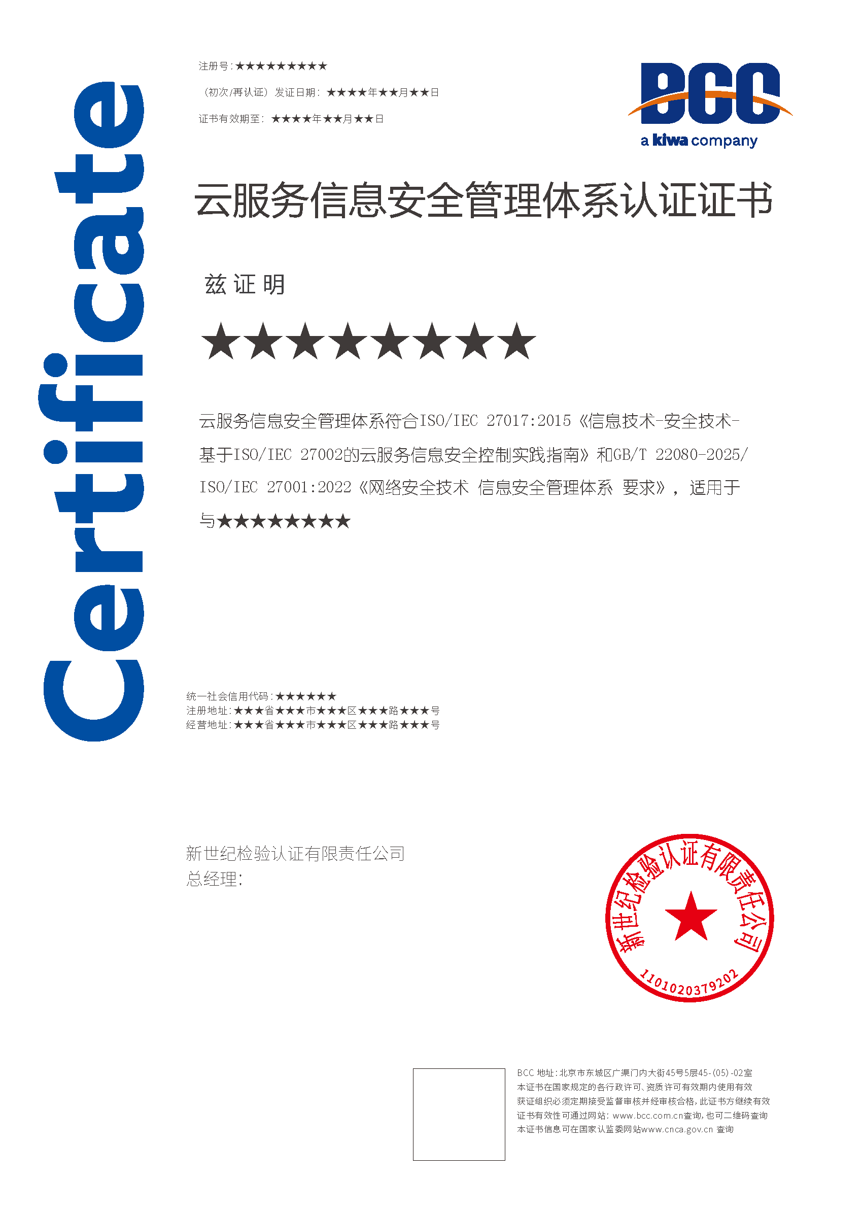 組織的信息安全管理體系(ISMS)發(fā)證機構(gòu)為BCC 時,需提供以下資料: